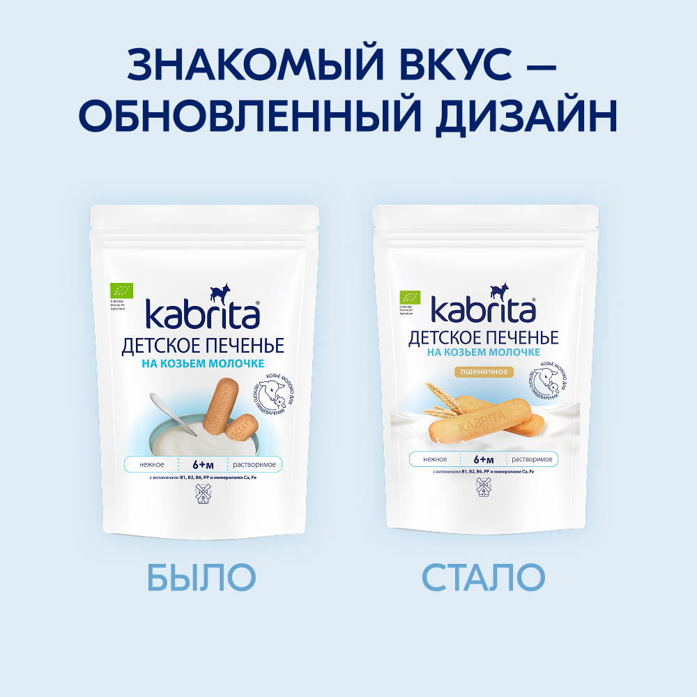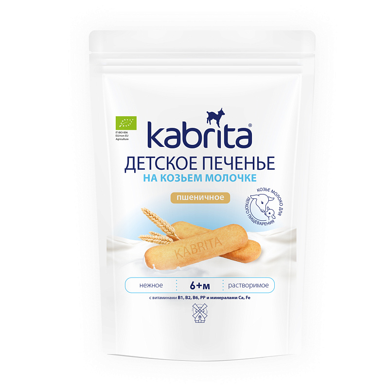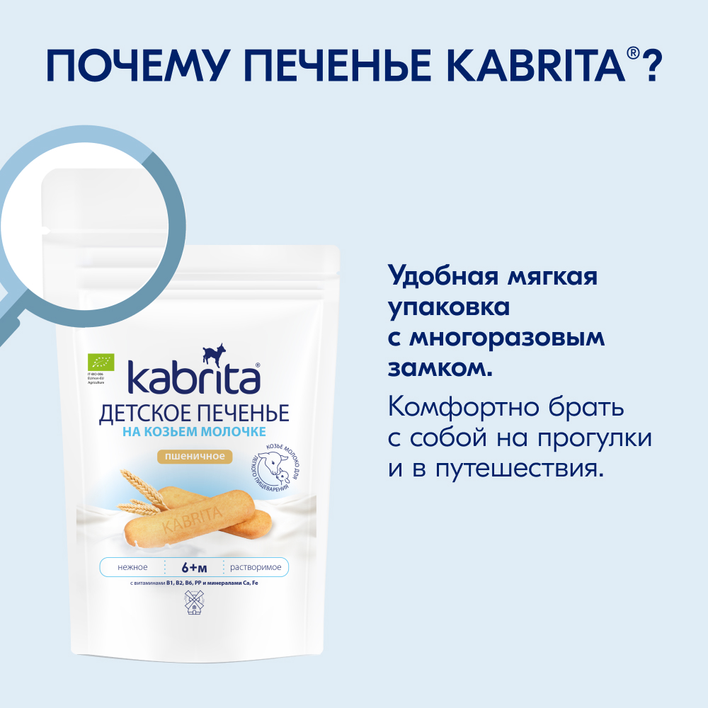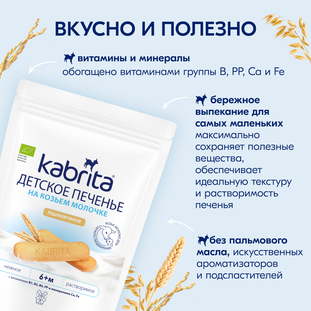 Детское печенье Kabrita® – это вкусное нежное растворимое печенье на козьем молочке. Пшеничная мука тончайшего помола, полезное фермерское козье молоко, тростниковый сахар, витамины и минеральные вещества, а также технология бережного выпекания делают печенье очень нежным и полезным. Печенье станет любимым перекусом малыша - его удобно держать в маленькой ручке, а можно развести в молочной смеси, соке или чае. Первое печенье – новый этап в жизни малыша, который учится самостоятельно есть более твердую пищу.