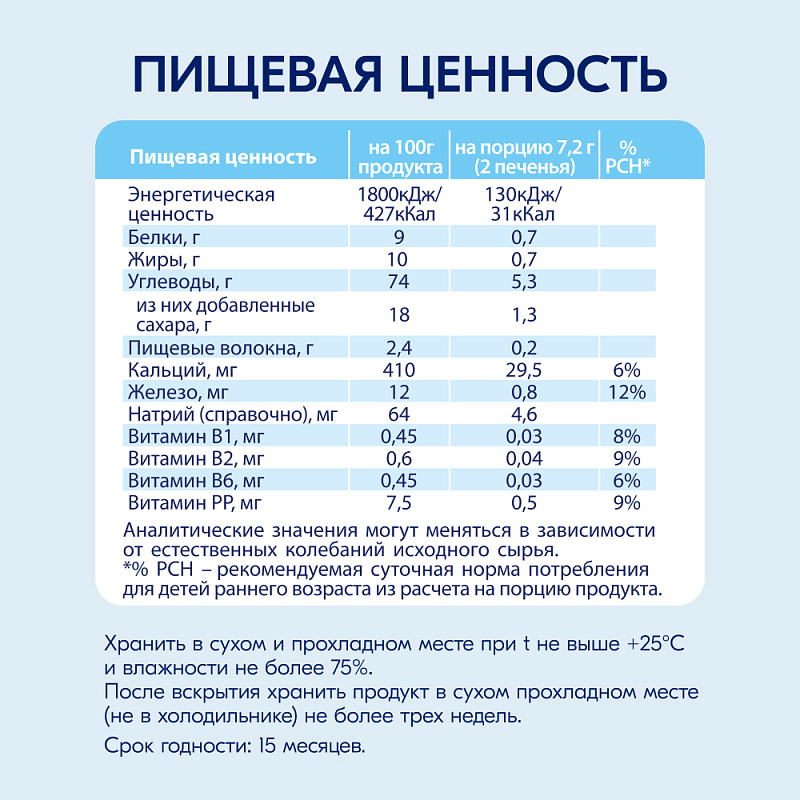 Продукт готов к употреблению. Печенье можно растворить в теплой молочной смеси, соке, чае или употреблять в сухом виде без предварительного растворения. 1 порция для детей от 6 месяцев ≈ 7,2 г (2 печенья).