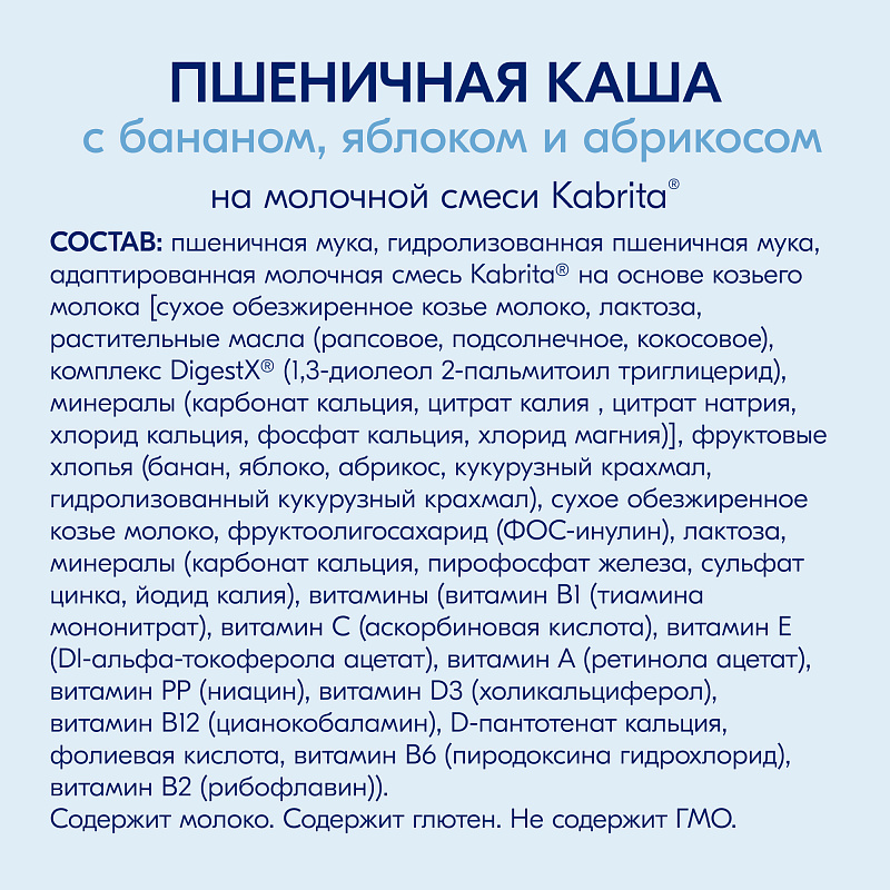 Пшеничная мука, гидролизованная пшеничная мука, адаптированная молочная смесь на основе козьего молока [сухое обезжиренное козье молоко, лактоза, растительные масла (рапсовое, подсолнечное, кокосовое), комплекс DigestX® (1,3-диолеол 2-пальмитоил триглицерид), минералы (карбонат кальция, цитрат калия , цитрат натрия, хлорид кальция, фосфат кальция, хлорид магния)], фруктовые хлопья (банан , яблоко, абрикос, кукурузный крахмал, гидролизованный кукурузный крахмал), сухое обезжиренное козье молоко, фруктоолигосахарид (ФОС-инулин), лактоза, минералы (карбонат кальция, пирофосфат железа, сульфат цинка, йодид калия), витамины (витамин В1 (тиамина мононитрат), витамин С (аскорбиновая кислота), витамин Е (Dl-альфа-токоферола ацетат), витамин А (ретинола ацетат), витамин PP (ниацин), витамин D3 (холикальциферол), витамин В12 (цианокобаламин), D-пантотенат кальция, фолиевая кислота, витамин В6 (пиродоксина гидрохлорид), витамин В2 (рибофлавин)).