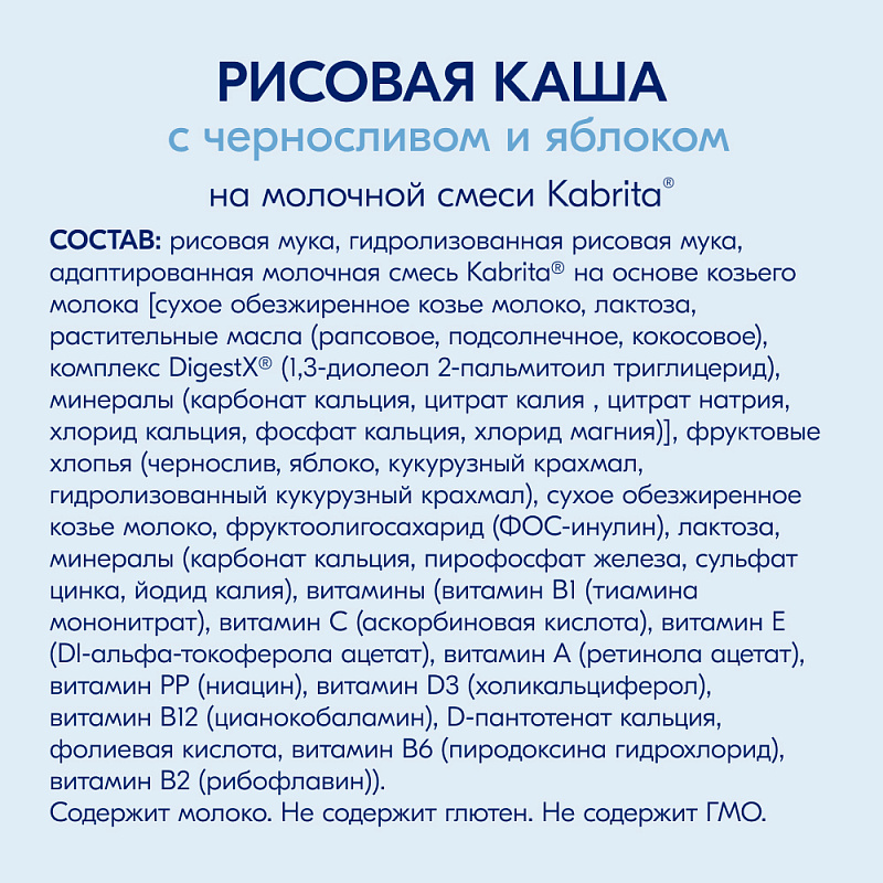 Нежная и воздушная рисовая каша на основе адаптированной смеси Kabrita® с добавлением спелых вкусных фруктов идеальна для сбалансированного питания малыша первого года жизни и расширения его вкусовых предпочтений. Сочетание питательного риса с фруктами и смесью Kabrita® из фермерского козьего молока обеспечивает высокую пищевую ценность. Приятный сливочный вкус каш Kabrita® достигается исключительно за счет натурального молочного сахара – лактозы и фруктов. Приготовлена без добавления подсластителей.
