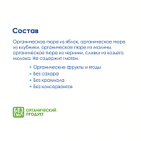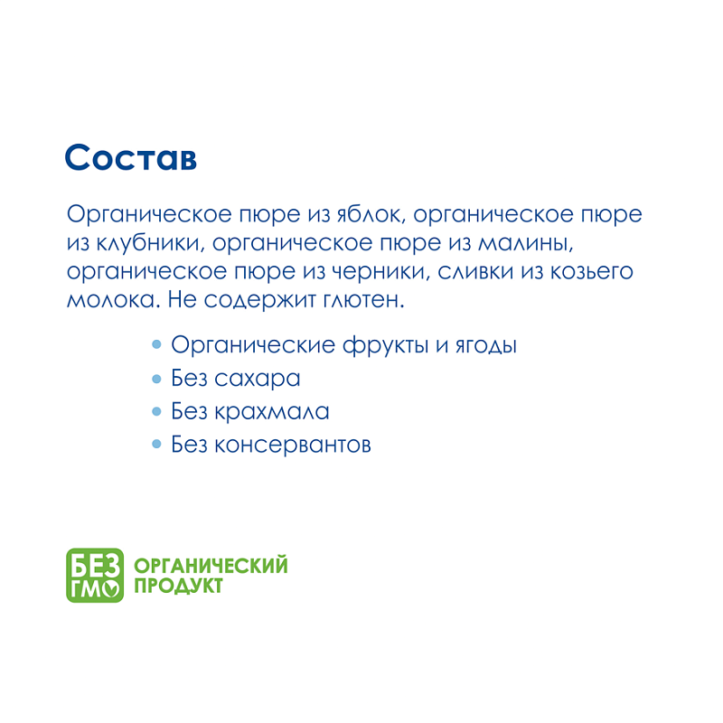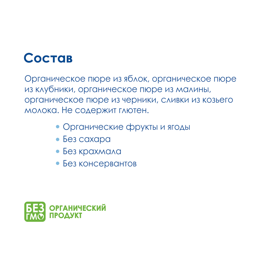 Органическое пюре из яблок, органическое пюре из клубники, органическое пюре из малины, органическое пюре из черники, сливки из козьего молока. Не содержит глютен.