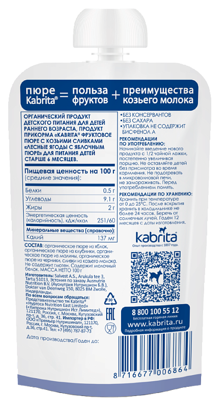 Изысканный десерт из органических фруктов и ягод с добавлением нежных сливок козьего молока. Прекрасное лакомство на любой случай, удобно брать с собой. Практичное решение для прогулок, путешествий, второго завтрака и полдника как для малышей, так и для детей более старшего возраста. Удобная и современная мягкая упаковка способствует развитию мелкой моторики малыша и навыков самостоятельности. Не требует хранения в холодильнике.