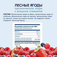 Органическое пюре из яблок, органическое пюре из клубники, органическое пюре из малины, органическое пюре из черники, сливки из козьего молока. Не содержит глютен.